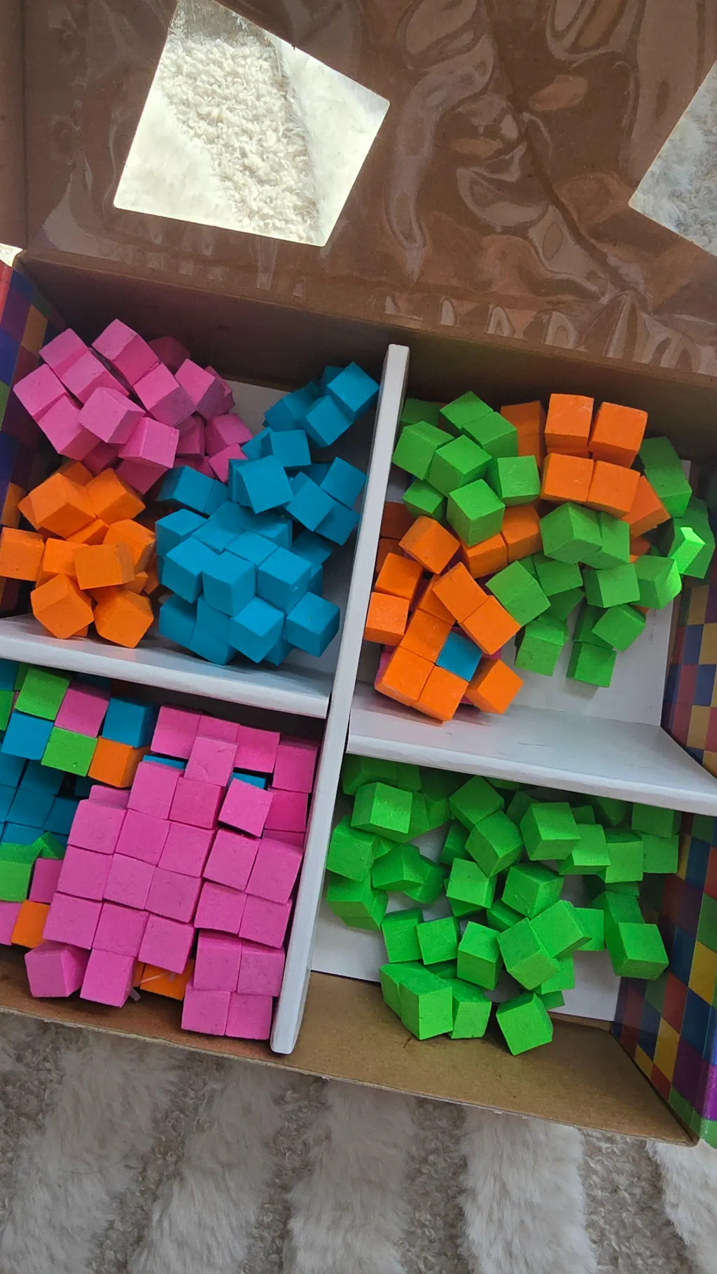 ▫️ zestaw miękkich kosteczek Kostkoliny w kolorze zielonym, turkusowym, pomarańczowym i różowym